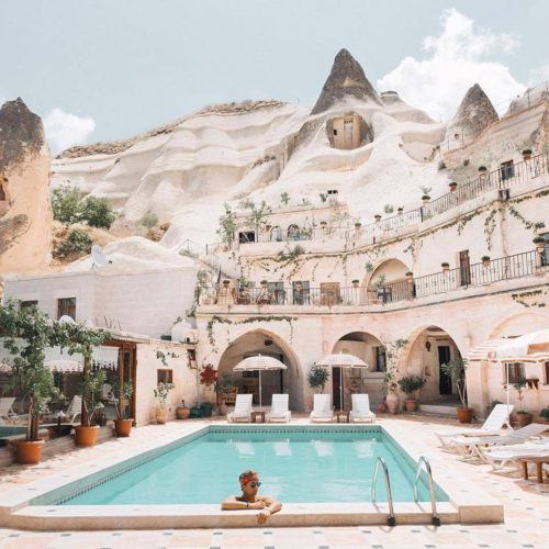 What a pool in front of the fairy chimneys of Cappadocia, Turkey.